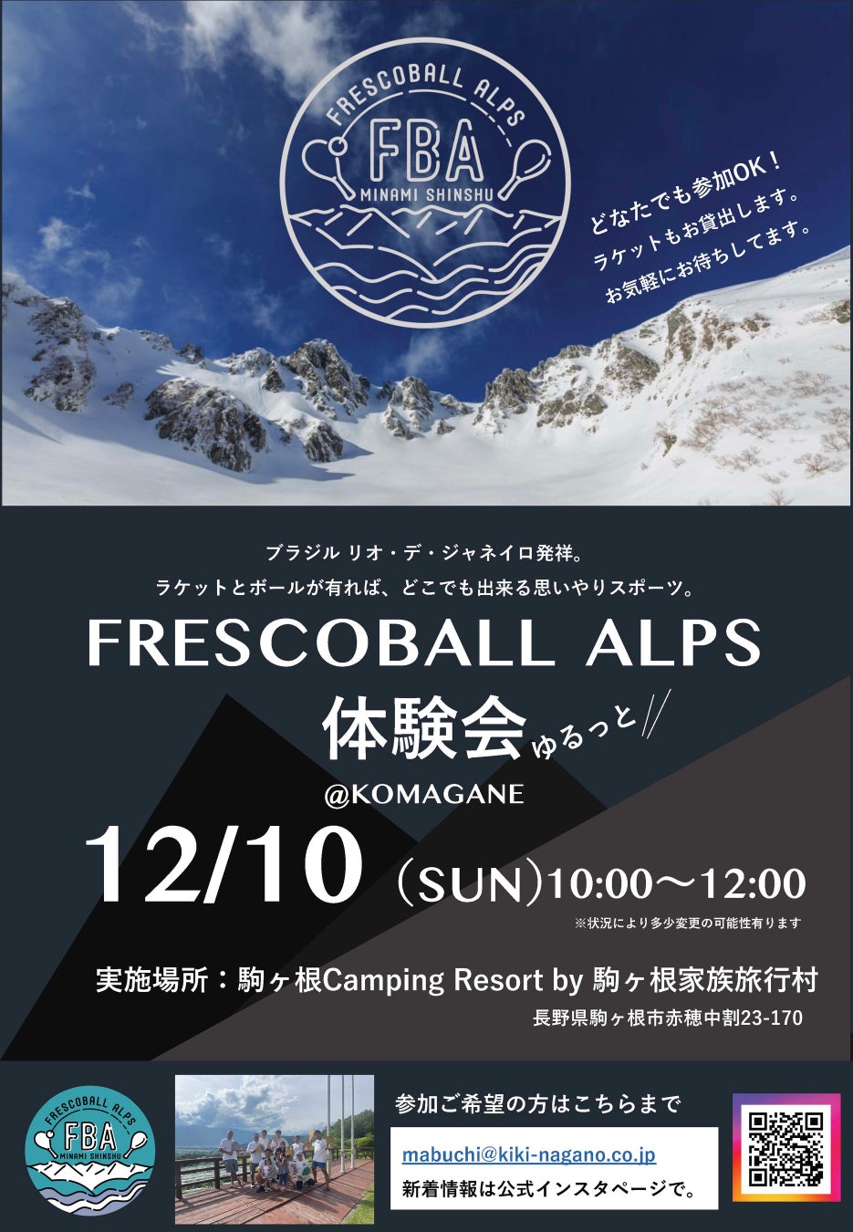 このたび、日本フレスコボール協会公認地域クラブ「FRESCOBALL ALPS」(長野県駒ヶ根市)が、12月10日(日)に駒ヶ根Camping Resort by 駒ヶ根家族旅⾏村でフレスコボール公式体験会を実施します。今回の会場は、駒ヶ根で随一のキャンプ場として、全国から多くのキャンプファンが集まる名所。通常3月〜11月まで営業しているキャンプ場スペースにて、今回特別にお借りすることができました。