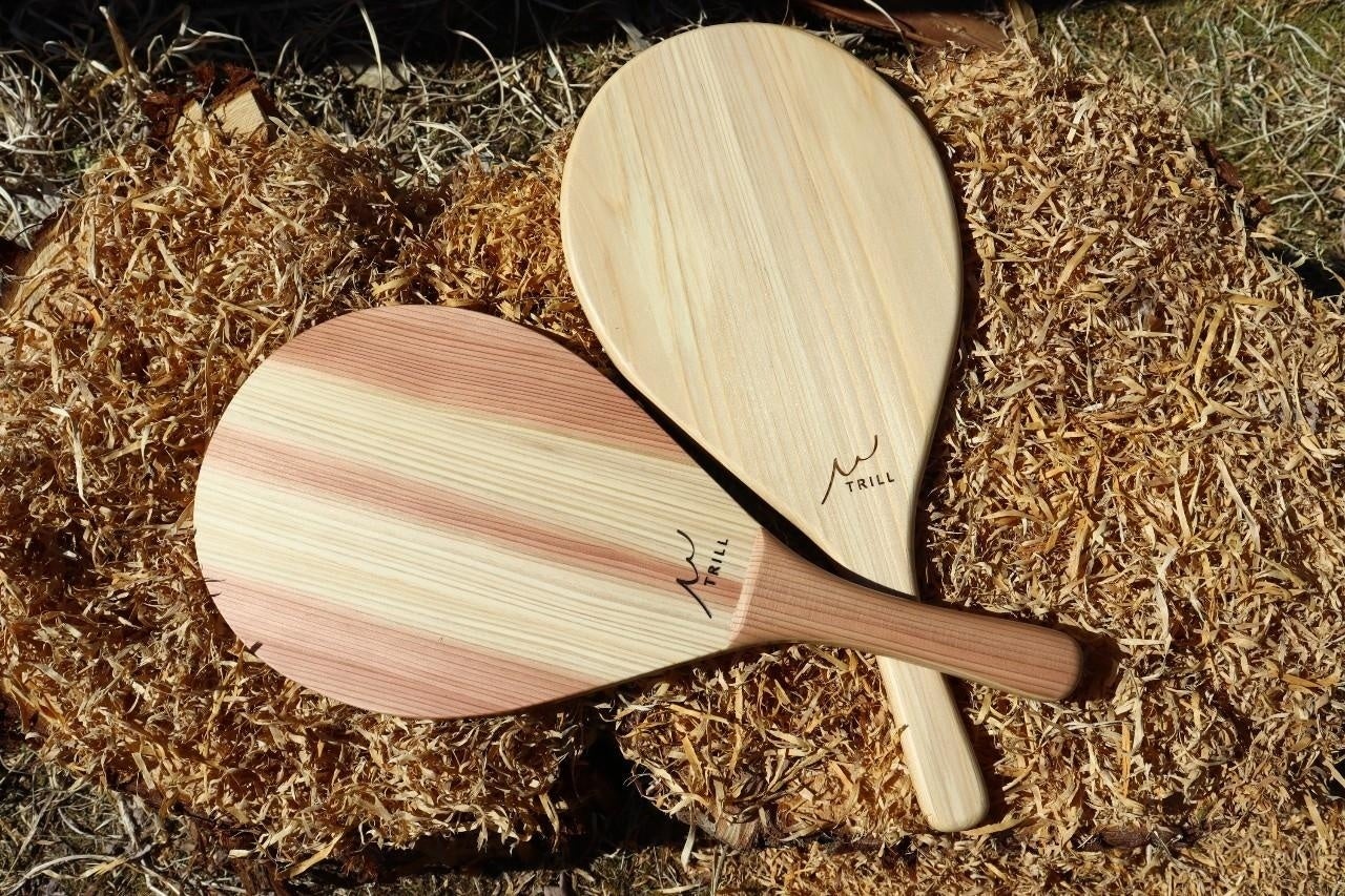 『TRILL』のつくり手である「山木屋」平山夫妻は、東京から「地域おこし協力隊」として陸前高田市の林業に従事した二人。「気仙杉」に魅せられ、地域おこし協力隊の任期終了後に完全移住。現在も林業・木工業を通じて「気仙杉」のブランド化にも取り組んでいます。フレスコボーラーとしても活躍し、「フレスコボールリクゼンタカタカップ2023」では、ベストラリー・アルブラン賞を受賞。選手目線で細部までこだわってつくられた『TRILL』のラケットには、試作過程においても多くの選手から注目が集まっていました。