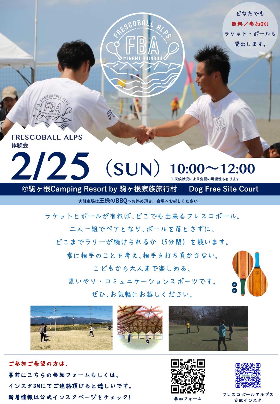 コミュニケーションデザインスポーツ”フレスコボール”の国内での普及活動を行っている、一般社団法人日本フレスコボール協会(以下、JFBA、代表理事 窪島剣璽)は、公認地域クラブの「FRESCOBALL ALPS」(長野県)が、2月25日に新年初となる「フレスコボール無料体験会」を駒ヶ根市で開催することを発表いたします。