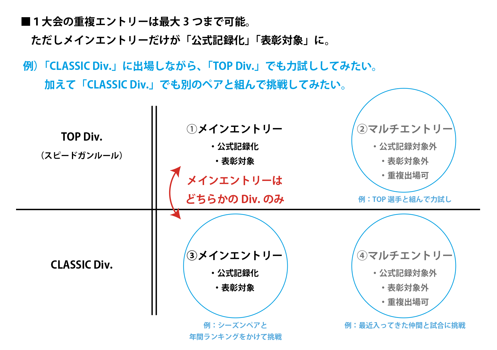 Q. 同一ペアで、シーズン中にメインエントリーの「Div.」を変えて出場することは可能ですか?(例:1戦目は「TOP」、2戦目は「CLASSIC」、3戦目は「TOP」等)
