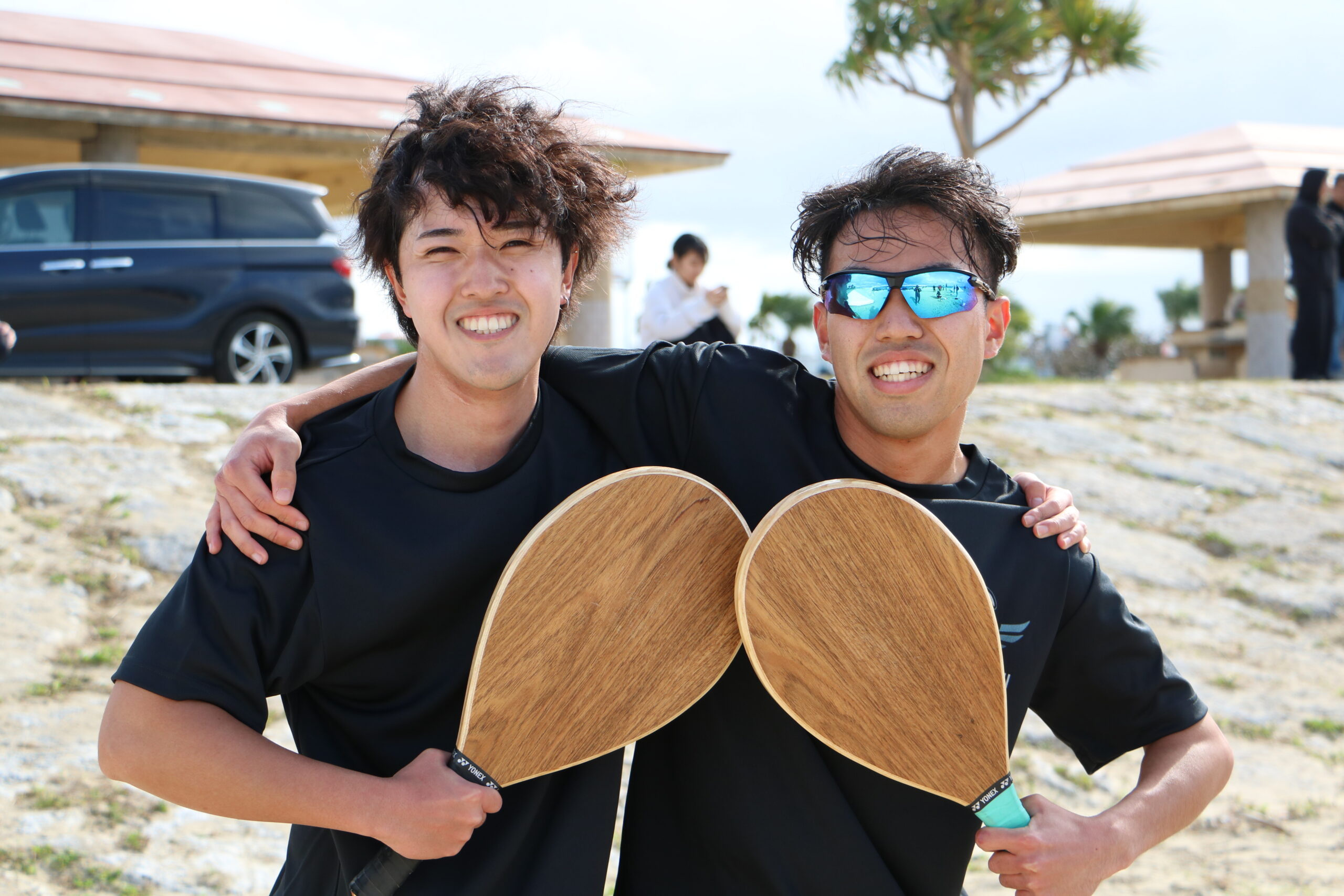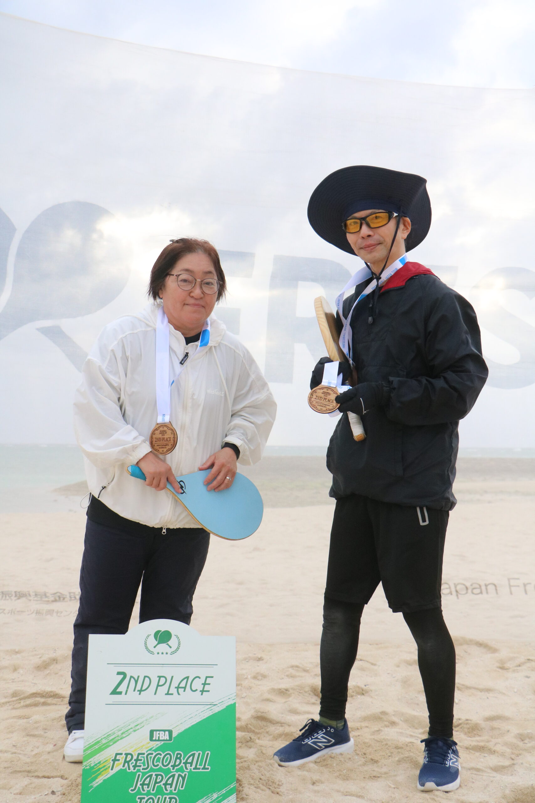優勝は、松岡伸樹×新山博子ペア。お二人の抜群のコンビネーションは、多少の風にもびくともせず。総打数324と積極的に仕掛けるラリーで優勝メダルを手にしました。2位は「日陰DEフレスコボール沖縄」クラブ設立後のデビュー戦である小寺&翁長ペア。試合の合間にいろんな選手に教えを請う姿も印象的で、落球も21と実力を証明。3位ペアは、若手のホープ・大川選手が元女子サッカー選手の白圡選手をリードし、落球19という安定感はもちろん、「ラリーが続く楽しさ」が会場を包み、CLASSICならではの個性が際立つ戦いとなりました。何より印象的だったのは、どのペアも笑顔でラリーを楽しんでいたこと。真剣勝負の中にも、フレスコボールらしい温かさがあふれるカテゴリでした。